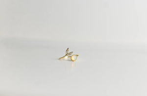 El anillo presenta un diseño abierto y ajustable, lo que le permite adaptarse cómodamente a diferentes tallas de dedo. La cola está adornada con un acabado liso y brillante, a menudo complementado con una pequeña perla sintética o una circonita que representa una burbuja ascendente.